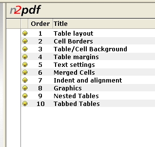 n2pdf 7.0 - Tables This database shows the table options supported by n2pdf 3.2. This database contains a number of documents which are there to demonstrate the possible options and settings. The main purpose is to demonstrate the supported table properties. Technical implementation can be found in the Script Library for "n2pdf".